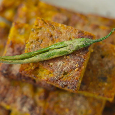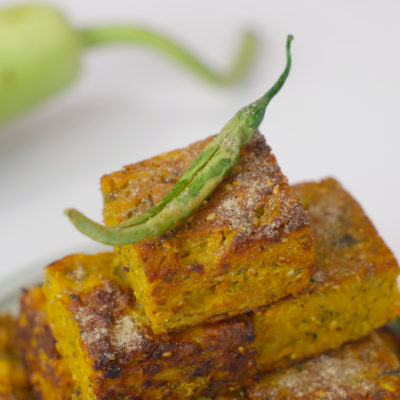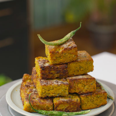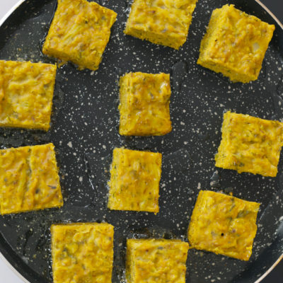 Once done the mixture should firm up. Carefully remove the mold from teh steamer and then run a knife along the sides to loosen it. Then upturn the mold on to a chopping board to remold it. Cut into equal size squares once it is still warm. |