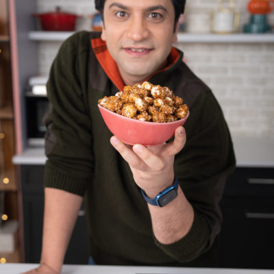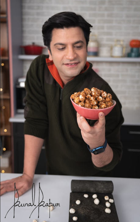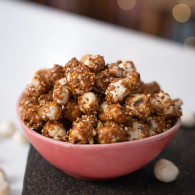 Gur Makhana is a popular North Indian snack made from lotus seeds, also known as fox nuts or phool makhana, coated with jaggery or gur, which is a type of unrefined cane sugar. It is commonly consumed during festive occasions, as well as during fasting or as a healthy snack. The lotus seeds are first roasted until they become crunchy, and then coated with melted jaggery or gur, which gives them a sweet and caramelized flavor. Gur Makhana is often spiced with cardamom, cinnamon, and other warming spices, which add a delightful aroma and flavor to this traditional Indian treat. It is a popular source of essential nutrients like protein, fiber, and minerals, and is often considered a healthy alternative to regular snacks due to its natural sweetness and crunchy texture.