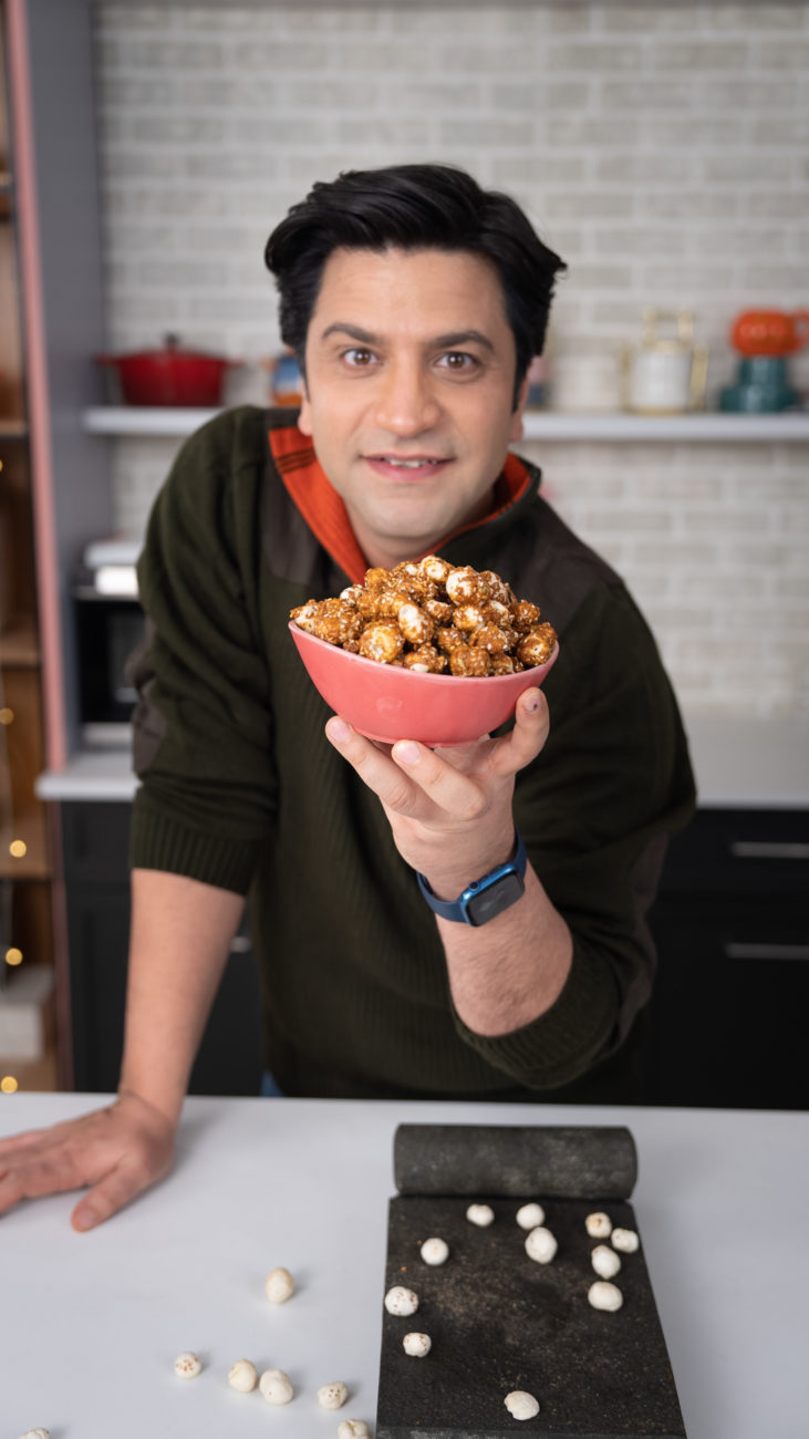 Gur Makhana is a popular North Indian snack made from lotus seeds, also known as fox nuts or phool makhana, coated with jaggery or gur, which is a type of unrefined cane sugar. It is commonly consumed during festive occasions, as well as during fasting or as a healthy snack. The lotus seeds are first roasted until they become crunchy, and then coated with melted jaggery or gur, which gives them a sweet and caramelized flavor. Gur Makhana is often spiced with cardamom, cinnamon, and other warming spices, which add a delightful aroma and flavor to this traditional Indian treat. It is a popular source of essential nutrients like protein, fiber, and minerals, and is often considered a healthy alternative to regular snacks due to its natural sweetness and crunchy texture.