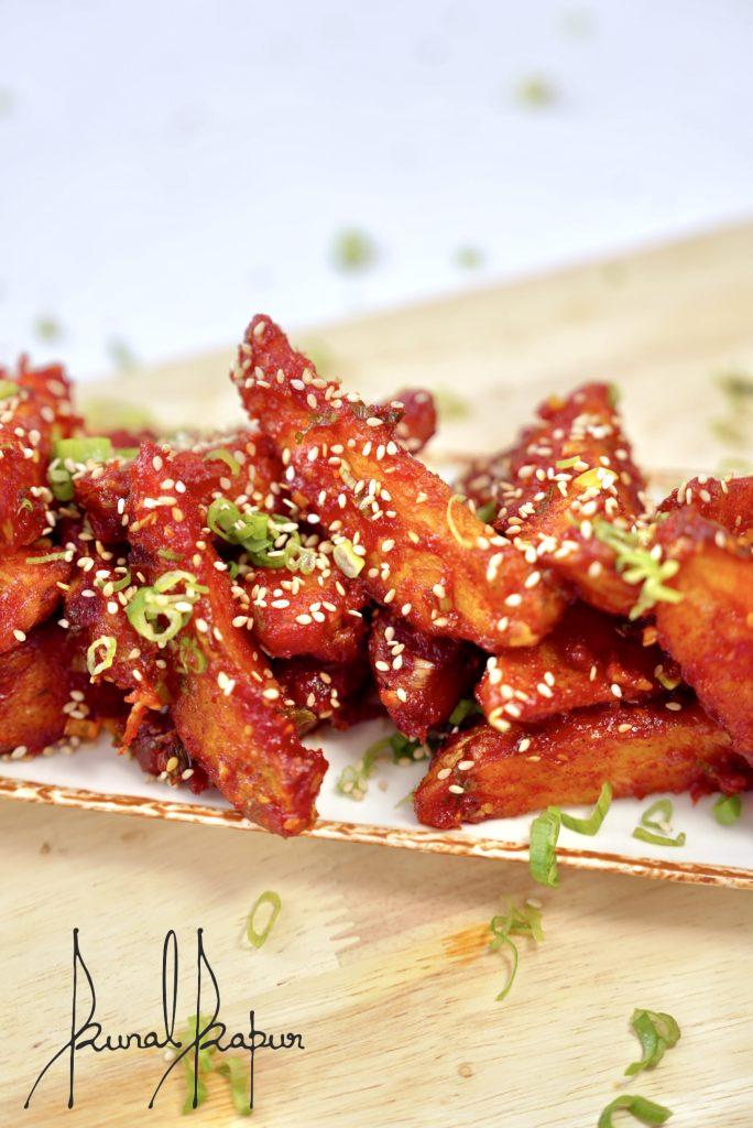 For sauce, in a hot pan, drizzle some oil, ginger, garlic, tomato ketchup, gochujang, vinegar, light soy sauce, honey, salt, chopped spring onions and sesame seeds. Mix them well. Now add the fried potatoes and toss. Sprinkle some chopped spring onions and serve hot! |