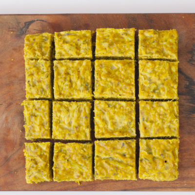 Once done the mixture should firm up. Carefully remove the mold from teh steamer and then run a knife along the sides to loosen it. Then upturn the mold on to a chopping board to remold it. Cut into equal size squares once it is still warm. |